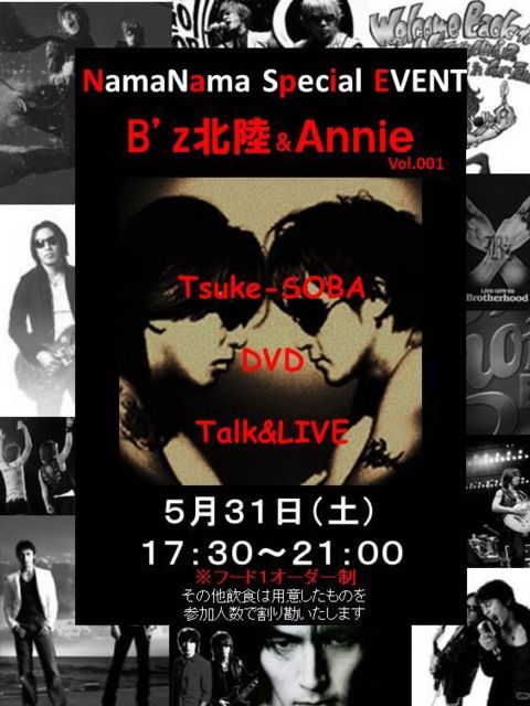 久々に高岡にてDVD鑑賞会します。 【日時】 5月31日(土) 17:00〜21:00終了予定 【場所】 富山県 高岡市 つけそばcafe Annie 詳細 http://r.gnavi.co.jp/90d9twys0000/ 【参加費】 お店にて1フード注文お願いします。(つけそば、つけめん等麺類になります) + 幹事にて飲食物持ち込みます(お菓子、ソフトドリンク、お酒等)ので、人数にもよりますが数百円程度参加者でワリカンいたします。 【募集定員】 15名 【スケジュール】 17:00〜 開場 17:30〜 DVD鑑賞会スタート♪ B'z LIVE-GYM Pleasure2013 ENDLESS S