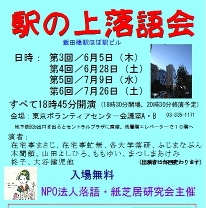 6月5日木曜日18時45分(開場18時30分)から「第3回駅の上落語会」を開催します。 会場は、東京ボランティアセンター会議室A、B(定員80人)、ほぼ飯田橋駅ビルです。 NPO法人落語・紙芝居研究会主催。 http://raku-kami.com (公式ホームページ) 入場無料。見学自由。 東京ボランティア・市民活動センター 10階 会議室 東京都新宿区神楽河岸1−1 セントラルプラザ 10階 ︎03-3235-1171 ≪JR「飯田橋」より徒歩1分≫ <アクセス> JR総武線「飯田橋」駅西口を出て右手の神楽坂