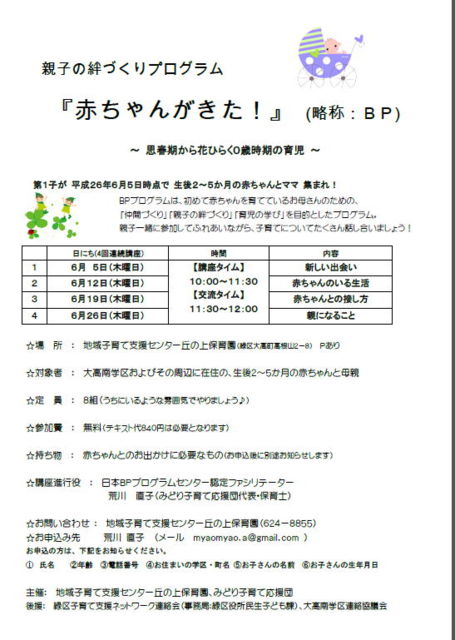 管理人様 広報失礼致します ************************ 親子の絆つくりプログラム「赤ちゃんがきた!」参加者募集!! 「赤ちゃんが来た!」(略称BP)は、0歳児を初めて育てている母親のための仲間・きずな・学びのプログラムです。 BPプログラムに参加すると... 1.子育て仲間ができます。 2.赤ちゃんがますますかわいく思えるようになり、親子の絆が深まります。 3.他の親も同じように悩んでいることがわかって、ストレスが軽減します。 4.子育ての孤立感から解放されます。 5.子どもの心