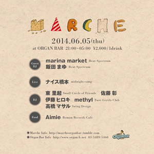 明日(6/5)のイベント告知 失礼致します。 今回のMarche! marina marketさん、飯田 まゆさんをゲストに AimieさんのFoodもある豪華さ♡ 是非お越し下さい。 そして、明日Small Circle of Friendsの 最新ニュースが更新されます。 そちらもチェック! http://scof75.blogspot.jp/2014/06/small-circle-of-friends.html 6/5(木)21:00-5:00 ¥2000 / 1 Drink マルシェ at OrganBar Music : Soul, AOR, Rock, SoftRock...and more Guest DJ : marina market (Beat Spectrum) 飯田 まゆ (Beat Spectrum) Special