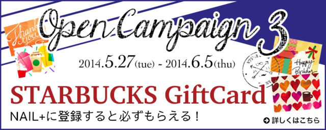 素敵なネイルを投稿して、スタバカードをもらっちゃおう! ネイルガールウェルカムキャンペーン (6/10まで) http://nailplus.me/mode/campaign/nailgirlphoto ネイルしている女性全員、参加いただけます♡ サロンやセルフでやったネイル画像を投稿するとスタバカードがもらえちゃう! ぜひご覧くださいませ。 ネイルプラス トップページはこちら http://nailplus.me/ twitter https://twitter.com/nail_plus facebook https://www.facebook.com/NailplusbyGMO