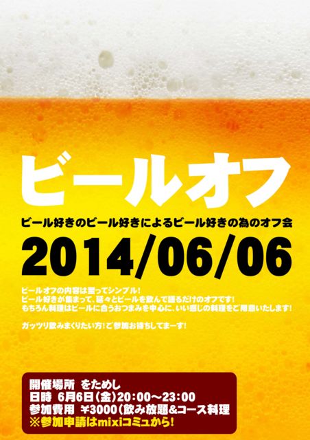 ビールが好きだ! そう・・・黄金色に輝くあの素敵飲料・・・ビールおいしいよねっ!もう夏くるしねっ! ってな事で、6月6日(金)にビールオフを開催します! 内容は至ってシンプル! ビール好きが集まって、延々とビールを飲んで語るだけのオフです! もちろん料理はビールに合うおつまみを中心に、いい感じの料理をご用意いたします! ガッツリ飲みまくりたい方!ご参加お待ちしてまーす! 開催場所 をためし 日時 6月6日(金)20:00〜23:00 参加費用 ¥3000(飲み放題&コース料理
