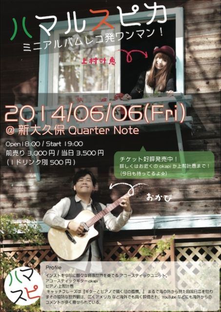 6月6日(金)新大久保QuarterNote ハマルスピカ レコ発ワンマン open:18:00 / start: 19:00 出演時間:19:00〜 出演: ハマルスピカ(okapi&上村叶恵) / 入場料: 前売り3,000円、当日3,500円(別1オーダー) ハマルスピカのワンマンライブ& 初のミニアルバムCD レコ発記念ライブです ライブはokapiさんと上村叶恵さんのそれぞれの曲もされるようです。 予約はHPからどうぞ http://uemura-kanae.com/ 残りわずかです アクセス http://quarter-note.com/access.html JR新大久保駅か