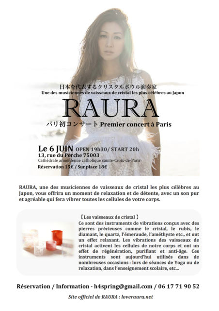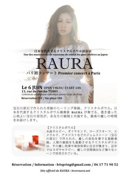 日本を代表するクリスタルボウル演奏家RAURAがパリで初コンサートを開催します。宝石の原石で作られた奇跡のヒーリング楽器、クリスタルボウルの振動は、人間の細胞を活性化させ、ヒーリング効果だけでなく抗酸化効果(=アンチエイジング効果)があると言われています。この奇跡のヒーリング楽器を体感しにきませんか? 日時:6月6日(金)19時半開場/20時開演 チケット:予約15€当日18€ (入場限定50名) 場所:13, rue du Perche 75003 予約: h4spring(at)gmail.com youtubeでロレアルのイベントの出演した時のビデ