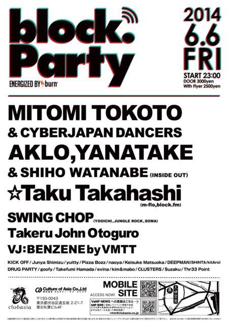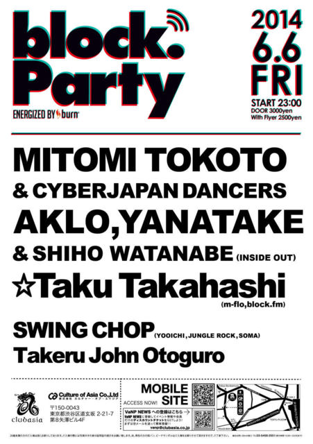 6月6日に開催されるTheBlockPartyの情報です! ご対応できますので、気になる方はお気軽に連絡ください♪ 以下、イベント情報です! 日本のトップDJ、世界を舞台に活躍する海外勢、さらにこれからのシーンを担うDJ達がラジオプログラムを持つダンスミュージックの総合情報サイト『block.fm』のオフィシャルパーティー「The Block Party energized by burn」 今回はゲストに block.fmの人気ヒップホップ番組 「INSIDE OUT」より AKLO, YANATAKE, SHIHO WATANABE が登場。 さらに block.fm「楽屋裏RADIO」より HOUSE DJ,PRODUCER の MI