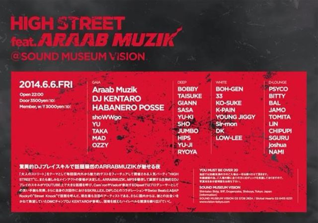 管理人様告知失礼します。 エントランスで、 ★★★★★★★★★★★★★★★★★★★★★★★ 「タイスケのゲストでビジョン」 ★★★★★★★★★★★★★★★★★★★★★★★ と言って頂ければ、何名様でもゲスト料金でご入場頂けます。 ALL TIME 2000YEN/1D のゲスト料金です。 また個別にでもゲストお取りできますので、メッセージください。 宜しくお願いします。 6/6(金)「HIGH STREET」@渋谷VISION OPEN:22:00 CLOSE:5:00 GAIA: ARAAB MUSIC KENTARO HABANERO