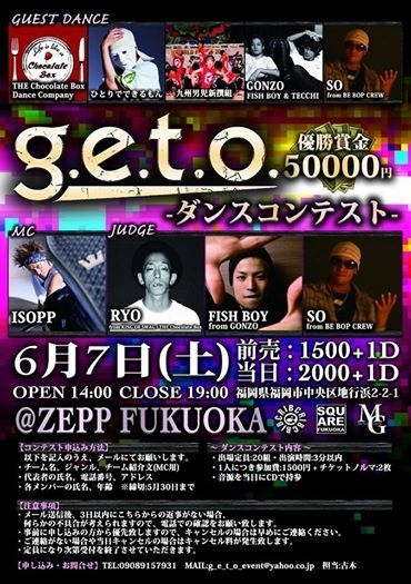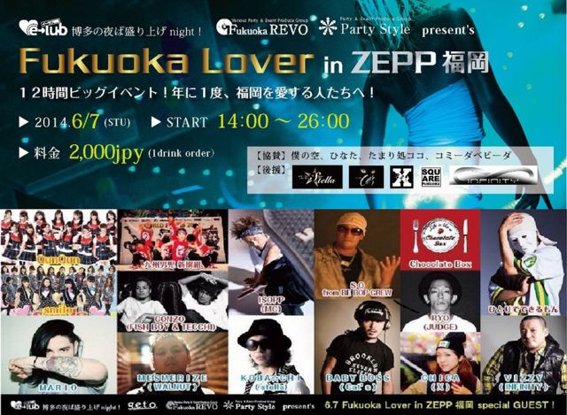 ¡ù¡ùFUKUOKA LOVER ¢ö VOL.£±¡ù¡ù ¡Ú³«ºÅÆü¡Û£¶·î£·Æü [ÅÚ] ¡Ú»þ´Ö¡Û £±£´:£°£°¡Á£²:£°£° [12»þ´Ö] ¡Ú²ñ¾ì¡Û Zepp FUKUOKA ¡ÚÎÁ¶â¡ÛÁ°Çä¤ê¡ï£±£µ£°£°(£±drink¥ª¡¼¥À¡¼) ÅöÆü¡ï£²£°£°£°(£±drink¥ª¡¼¥À¡¼) ¡ÊMC¡ËISOPP ¡Ô£±Éô¡Õ¥¢¥¤¥É¥ë 14:00¡Á ¡¦Qun Qun ¡¦Smile ¡¦10COLOR'S ¡Ô£²Éô¡Õ¥²¥¹¥È¥À¥ó¥¹&¥À¥ó¥¹¥³¥ó¥Æ¥¹¥È (Í¥¾¡¾Þ¶â5Ëü±ß) 16:00¡Á19:00 ¡Á¡Á ¥²¥¹¥È¥À¥ó¥¹ ¡Á¡Á ¡¦SO¡Úfrom BE BOP CREW¡Û ¡¦GONZO¡ÚFISH BOY & TECCHI¡Û ¡¦THE Chocolate Box Dance Company ¡¦¤Ò¤È¤ê¤Ç¤Ç¤­¤ë¤â¤ó ¡¦¶å½£ÃË»ù¿·ÀñÁÈ ¡Á¡Á MC ¡Á