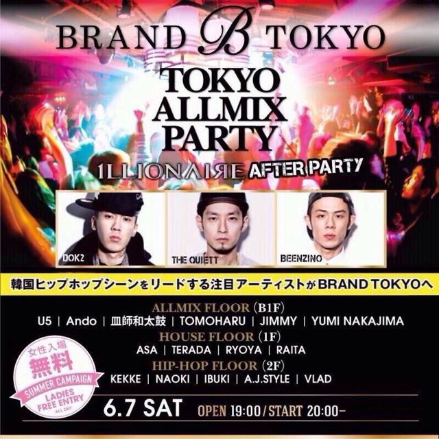 ¶ÛµÞ·èÄê!! ´Ú¹ñHIPHOP¤ÎÃíÌÜ¥¢¡¼¥Æ¥£¥¹¥È¤¬BRAND TOKYO¤Ø¢ö TOKYO ALLMIX PARTY ¡ß ILLIONAIRE After Party 2014.06/07.Sat START 20:00¡Á VENUE : BRAND TOKYO ¥¨¥ó¥È¥é¥ó¥¹¤Ë¤Æ ¡Ø¥¸¥ß¡¼¤Î¥²¥¹¥È¤Ç¥Ñ¡¼¥Æ¥£¡¼¡Ù¤È¸À¤Ã¤ÆÄº¤±¤ì¤Ð ÃËÀ2000/2D¡¢½÷ÀÆþ¾ì̵ÎÁ1D¤Ë¤ÆÆþ¾ì¤Ç¤¤Þ¤¹¡ª¡ª ¸½ºß¤Î´Ú¹ñ¥Ò¥Ã¥×¥Û¥Ã¥×¥·¡¼¥ó¤ò¥ê¡¼¥É¤¹¤ëÃíÌÜ¥¢¡¼¥Æ¥£¥¹¥È¡¢ ILLIONAIRE RECORDS¤Ë½ê°¤¹¤ëDok2¡¢The Quiett¡¢Beenzino¡¢¿Íµ¤¤È¼ÂÎϤò·ó¤ÍÈ÷¤¨¤¿¥é¥Ã¥Ñ¡¼¤¬¡ÖBRAND TOKYO¡×¤ËÍ·¤Ó¤Ë¢ö ¿ºÌ¤Ê¥¸¥ã¥ó¥ë¤Î²»³Ú¤ÈÊ£¿ô¥Õ¥í¥¢¤ò²óÍ·¤·¤Æ³Ú¤·¤àBRAND