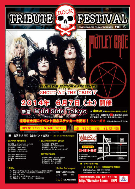 ¡ØTRIBUTE¡¡ROCK FESTIVAL ¡Ù- £Ö£Ï£Ì.£¸ ¡¡FIVE STAR FACTORY PRESENTS ! [ MOTLEY CRUE ]¡¡ ¡ØSHOUT AT THE CRUE ¹¡Ù ¥â¥È¥ê¡¼¥¯¥ë¡¼¤ò¥È¥ê¥Ó¥å¡¼¥È¤·¤ÆÁ´£´BAND¤¬¸ß¤¤¤Î»ý¤Ã¤Æ¤¤¤ë ¥â¥È¥ê¡¼¥¯¥ë¡¼¤ËÂФ¹¤ëÇ®¤º²¤ò¶»¤ËÊú¤¡¢£Ì£É£Ö£Å¤Ë¤Æ·ãÆÍ¡ª Á´¶Ê¥¯¥ë¡¼¡ª Á´¥Ð¥ó¥É¥¯¥ë¡¼¡ª ¥¯¥ë¡¼¹¥¤¤Ë¤Ï¤¿¤Þ¤é¤Ê¤¤°ìÆü¤Ç¤¹¡ú ²ñ¾ì¡§¿·½É Wild Side Tokyo Æü»þ¡§2014ǯ6·î7Æü¡ÊÅÚ¡Ë 17¡§30¥ª¡¼¥×¥ó 18¡§00¥¹¥¿¡¼¥È 22¡§00½ª±é Á°Çä¤êͽÌó¡§2500±ß ¡¡ ¡¡¡¡¡¡¡¡ ÅöÆü¡§2800±ß ---