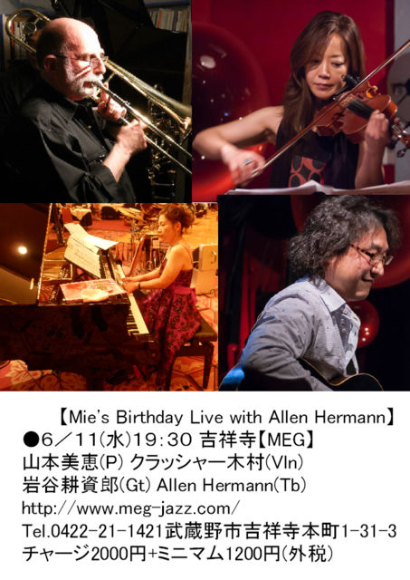 ¢ãMie's Birthday Live with Allen Hermann¢ä ¢¡£¶¡¿£±£±(¿å)£±£¹¡§£³£° µÈ¾Í»û¡ÚMEG¡Û »³ËÜÈþ·Ã(P)¥¯¥é¥Ã¥·¥ã¡¼ÌÚ¼(Vln)´äë¹Ì»ñϺ(Gt) Allen Hermann(Tb) http://www.meg-jazz.com/ Tel.0422-21-1421 Éð¢Ìî»ÔµÈ¾Í»ûËÜÄ®1-31-3 ¥Á¥ã¡¼¥¸2000±ß+¥ß¥Ë¥Þ¥à1200±ß(³°ÀÇ)