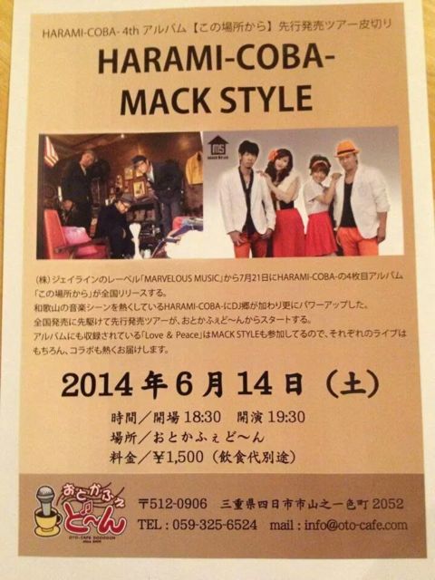 日にち→6月14日(土) 場所→おとかふぇど〜ん チケット→1500円(飲食代別) 出演→HANABI-COBA-/MACK STYLE