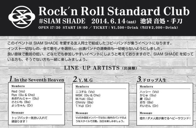 Åö¥³¥ß¥å¥Ë¥Æ¥£¡¼Éû´ÉÍý¿Í¤Î¤«¤¸¤å¤È¿½¤·¤Þ¤¹¡£ °ÊÁ°¤è¤ê¹ðÃΤ·¤Æ¤¤¤Þ¤·¤¿Á´¤ÆSIAM SHADE¤Î¥«¥Ð¡¼¥Ð¥ó¥É¤Ë¤è¤ë ÂХХ󥤥٥ó¥ÈLIVE¤Î¾ÜºÙ¤¬·è¤Þ¤ê¤Þ¤·¤¿¡£ Á°Çä¤ê¥Á¥±¥Ã¥È¤´´õ˾¤ÎÊý¤Ï¡¢ ¥³¥á¥ó¥ÈÍó¤Ë½ñ¤¹þ¤à¤«¡¢¤Þ¤¿¤Ï»ä¤ËľÀÜ¥á¥Ã¥»¤ò¤ª´ê¤¤¤·¤Þ¤¹¡£ SIAM SHADE¤¬»Ä¤·¤Æ¤¯¤ì¤¿Ì¾¶Ê¤Î¿ô¡¹¤ò³§¤Ç²Î¤¤¡¢Â䶤·¤Þ¤·¤ç¤¦¡ª ¤½¤ì¤Ç¤Ï¿¤¯¤ÎÊý¤Î¤´»²²Ã¤ò¤ªÂÔ¤Á¤·¤Æ¤ª¤ê¤Þ¤¹¡ý ¡ã¾ÜºÙ¡ä ROCK'N ROLL STANDARD CLUB¡¡¡Á¡ô01 SIAM SHADE¡Á 2014ǯ¡¡6·î14Æü¡ÊÅÚ¡Ëat ÃÓÂÞ¼êÅá ¤³¤Î¥¤¥Ù¥ó¥È¤ÏSIAM SHADE¤ò°¦¤¹¤ëͧ¿ÍƱ»Î¤Ç·ëÀ®¤·¤¿ ¥³¥Ô¡¼¥Ð
