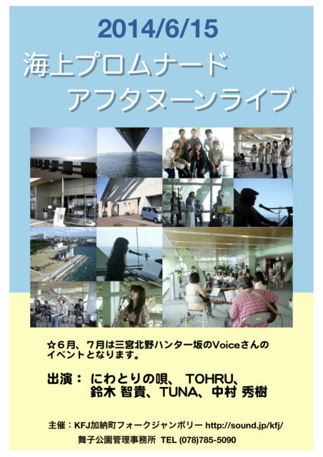 6/15 Éñ»Ò¸ø±à ³¤¾å¥×¥í¥à¥Ê¡¼¥É¥é¥¤¥Ö Ëè·îÂè»°ÆüÍËÆü KFJ²ÃǼĮ¥Õ¥©¡¼¥¯¥¸¥ã¥ó¥Ü¥ê¡¼ http://sound.jp/kfj/ ¼çºÅ¤Î Äê´ü¥é¥¤¥Ö¥¤¥Ù¥ó¥È¡£ £¶·î¡¢£··î¤Ï»°µÜËÌÌî¥Ï¥ó¥¿¡¼ºä¤ÎVoice http://livebarvoice.com/ ¤µ¤ó¤Î ¥¤¥Ù¥ó¥È¤È¤Ê¤ê¤Þ¤¹¡£ ÌÀÀÐøϩ³¤¶®Âç¶¶8F ³¤¾å¥×¥í¥à¥Ê¡¼¥É http://www.hyogo-park.or.jp/maiko/contents/sisetsu/area_prom.html ¡¡ ÆÃÀߥ¹¥Æ¡¼¥¸¤Ë¤Æ13:00¡Á16:30̵ÎÁ¡Ê⤷¡¢Æþ´ÛÎÁ 300±ß¤¬É¬ÍפǤ¹¡Ë 6/15¡¡TOHRU http://mixi.jp/show_friend.pl?id=12034660¡¡ ¡¡¡¡¡¡ ÎëÌÚ ÃÒµ® https://twitter.com/tomo853