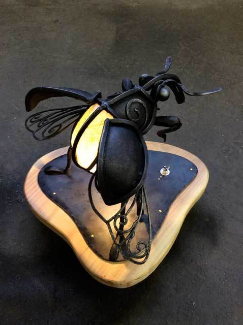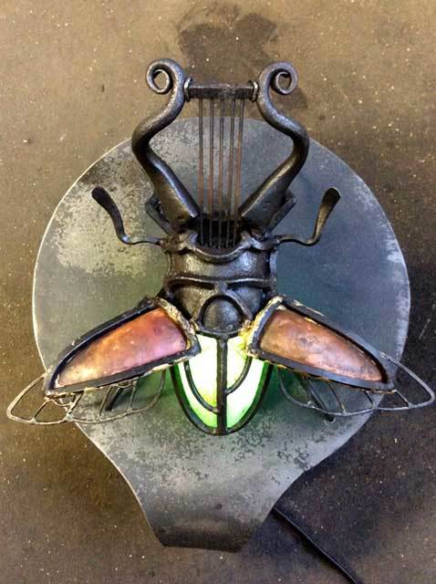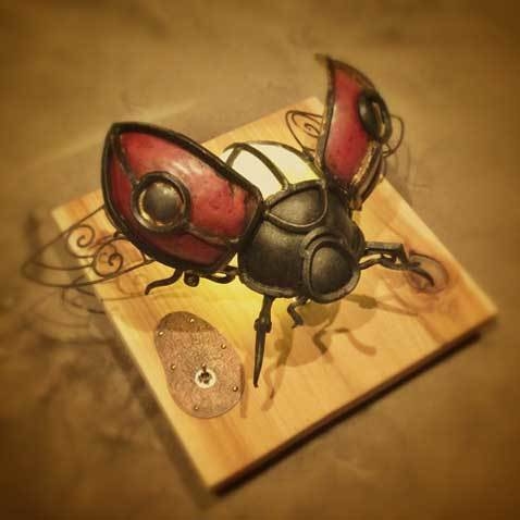 アートとは、と、難しく考えたあげく気が付けば作る事に純粋に気持ちが入れ込めなくなったことがあった。ならばただただ楽しめるものを作ってみてはどうかと、好きなものばかりを一つにしてみた。 自分の「好き」を納得のいく形にするのは思いのほか困難だったが、その壁は実に楽しく高いものだった。未だ続くその壁の途中ではありますが、是非覗いてやって下さい。鉄や銅で出来た昆虫たちが、音を出し灯りを灯します。 P,S 作品はアンプ内蔵スピーカーになっており、手持ちのiphoneやmp3プレーヤーをつないで音楽を聴く事が出来ます。 開催日:2