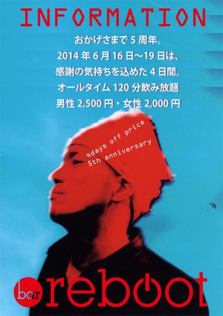 日頃はリブートをお引き立ていただきまして 誠に有り難う御座います。 さて当店は6月17日で 開店5周年を迎えさせて頂きます。 これも皆様のご愛顧の賜物と 心より感謝申し上げます。 つきましては、6/16(mon)〜6/19(thu)の4日間 感謝の気持ちを込めた4日間として 普段の飲み放題プランよりもお得なプラン 男性2.500円、女性2.000円の 120分飲み放題プランをご用意させて頂きます。 皆様の御来店を心よりお待ちしております。 bar reboot HEAD 西川隆宏