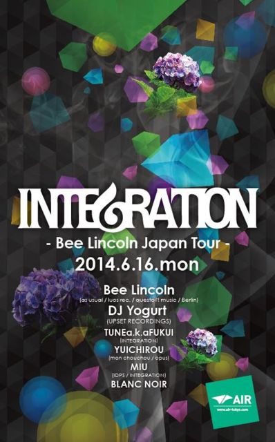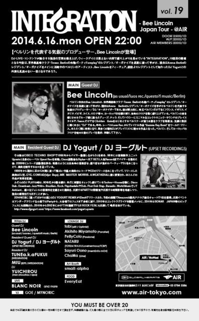 管理人様、告知スペース失礼いたします。 偶数月にて開催中のデイパーティー、INTEGRATION@AIRのお知らせです★ 19回目となる今回は、ドイツのベルリンからBee Lincolnをフィーチュアして開催します! 彼は世界最高峰クラブ・Tresor. Berlinの名物パーティForeplay”のレジデント/オーガナイズを長期に渡って手がけてきましたが、そのDJプレイにおいても実力派!ヨーロッパの至るところでゲストDJとして召喚され、今回、Japanツアーとして6/12より名古屋・大阪・京都など関西にてプレイした後、都内でも6/16からAIR・FAI・SOLFAと3日間に渡