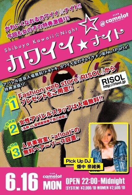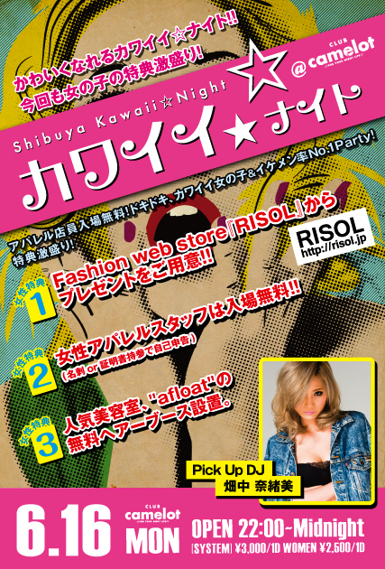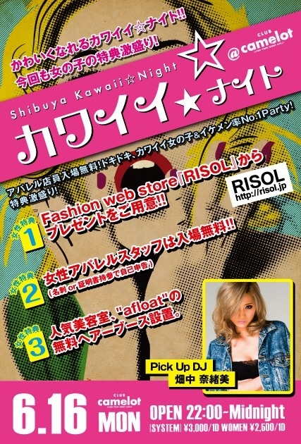 エントランスで五十嵐ゲストのキャメロットと言えば男性2000円1D、女性1500円1Dになります 6/16(Mon) 22:00~ 【カワイイ☆ナイト】 @CLUB camelot −−−−−−−−−− カワイイ女の子&イケメン率No1 Party"カワイイ☆ナイト" ・Fashion web store『RISOL』からプレゼントをご用意。 ・No.1フリマアプリ『STULIO』によるスナップ撮影アリ。 ・女性アパレルスタッフは入場無料!(名刺or証明書持参で自己申告) ・人気美容室"afloat"の無料ヘアーブース設置。 ・Pick Up DJ 畑中 奈緒美 RISOL http://ri