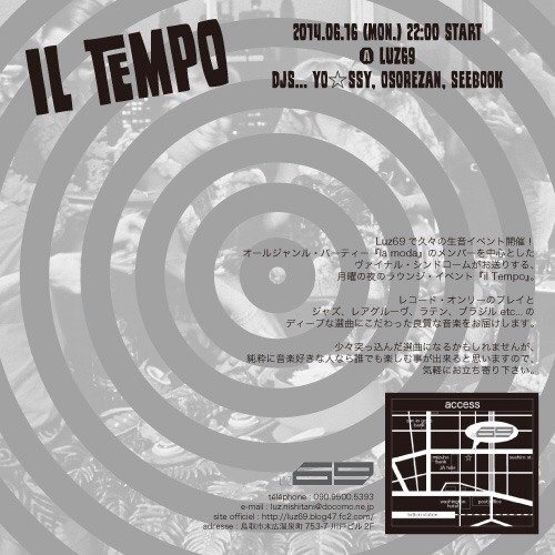IL TEMPO ON:2014.06.16(MON) 21:00 START AT:LUZ69 AVD:1000yen 1D RARE GROOVE / JAZZ / LATIN / DISCO / BLAZIL... DJ…YO☆SSY, OSOREZAN, SEEBOOK 90年代サンプリングHIPHOPの神髄を求める者が辿り着く 世間体からしたら不幸な結末的音楽タグ それがRARE GROOVE 誰も知らぬ音を今なお世界中のDIGGER達が探し求める今日 鳥取DOPEサイドが放つドス黒い月曜日 デジタル音源禁止