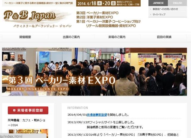 内容 ベーカリー洋菓子EXPO (サイト登録と名刺2枚で無料で入場出来ます) http://www.bakery-expo.com/2014/jp/index.html カフェ・喫茶食材ショーも同時開催してます。 新開発商品なども多数出展します。 気になった方は行ってみては? ※主催者は全く関係ありません。 原料・素材 小麦粉/ライ麦粉/米粉/ミックス粉 フラワーペースト 食用油脂(バター・マーガリン・ファットスプレッドラード、オリーブオイル、各種オイルなど) 酵母 砂糖・黒糖/塩 牛乳/生クリーム 卵 チョコレート 冷凍生地 各種
