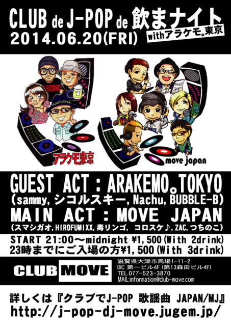 2014年 6月20日(金) 21:00~midnight @ CLUB MOVE (滋賀 膳所 ) = CLUB de J-POP de 飲まナイト with アラケモ。東京 = 今回のMOVE JAPANは、スペシャルレア企画!! 結成10年、沖縄から東京に進出し、大盛況J-POPイベントを開催している「アラケモ。東京」のDJメンバーとコラボレーションでJ-POPを操りまくります♪♪ JPOP好きの為のJPOPオンリーイベント!!! どこよりも熱いJPOP mix をお届けします!!! 誰でも参加できるイベントですので気軽に遊びに来てくださいね〜〜 そして1500円で3ドリンク付いた