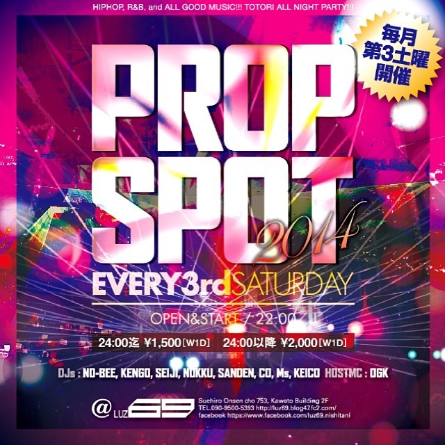 今週末6/21日 毎月第3土曜日はご存知 鳥取NO.1HIPHOP PARTY PROPSPOT 2014 vol.6 ■2014.6.21 (sat) ■@LUZ69 ■open 22:00〜 ■fee open〜24:00 - 1500(1d) 24:00〜 - 2000(1d) ■DJ'S NO-BEE/KENGO/SEIJI/NOKKU/CO/ SANDEN/MS/KEICO ■MC OGK ☆さて、今月も第3週目に突入してます。 って事で今週末はPROPSPOTです。 先週のLUZ 9周年の勢いそのままに今週も GOOD MUSIC onlyでお届けいたします。 PARTY好きな方も音楽好きな方もお酒好きな方も騒ぎたい方も みなさん楽しめる場所だと思います。 ジメジ