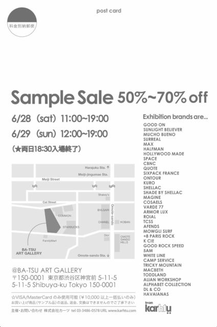 ※メール転送、SNS掲載可能です。 6ブランドが最終追加出店となりましたので、ご案内をさせて頂きます。 添付画像と下記詳細を再度ご確認して頂き、是非お越し頂けると幸いです。 どなた様でも入場可能ですので、友人・知人様へも告知して頂けると幸いです。 どうぞよろしくお願いします。 “Karhtu Sample Sale vol.14” ■50-70%OFF ※カードのご利用はVISA/MasterCardのみとし、10,000円以上1括払いのみとさせて頂きます。 ※一度お買い上げの商品の返品・交換はできませんのでご了承下さい。 ■日時 ・2014年6