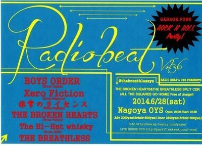 2014年06月28日(土)@大須 OYS http://www.oys-records.com/ 『RADIO BEAT vol.36』 Open 18:00 / Start 18:30 Adv \2000 / Door \2500 / drink +\500 ◆BAND◆ ・THE BROKEN HEARTS(from Tokyo) ・BOYS ORDER(from Osaka) ・Xero Fiction(from Nagoya) ・非常のライセンス(from Nagoya) ・The Hi-Hat whisky(from Gifu) ・THE BREATHLESS(from Yokkaichi)