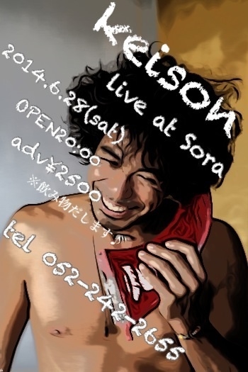Keison live!! 2014,6,28 (sat) Open 20:00くらい(笑) adv 2,500円 ※ドリンク付き @美容室Sora 愛知県名古屋市中区栄5-19-25ハイツ栄1F Tel (052)242-2655 素敵な時間を一緒に楽しみませんか ぜひお越しください! お待ちしてます