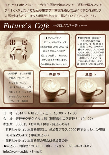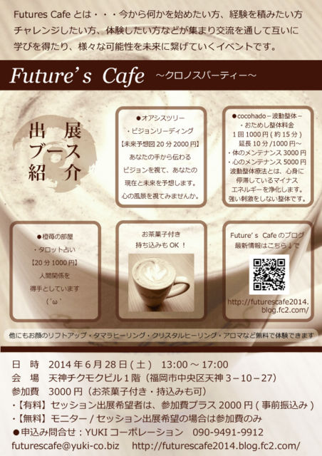 Futures Cafe¤Ï¡¢º£¤«¤é²¿¤«¤ò»Ï¤á¤¿¤¤Êý¡¢¤¹¤Ç¤Ë»Ï¤á¤Æ¤¤¤Æ¤¤¤ë¤¬Æü¤¬·Ð¤Ã¤Æ¤¤¤Ê¤¤Êý¡¢ ·Ð¸³¤òÀѤߤ¿¤¤Êý¡¢ ¿·¤·¤¤¤³¤È¤ò¥Á¥ã¥ì¥ó¥¸¤·¤¿¤¤Êý¤Ê¤É¤¬½¸¤Þ¤ê¡¢ ¸òή¤òÄ̤·¤Æ¡¢³Ø¤Ó¤òÆÀ¤¿¤ê¡¢¼«Ê¬¤òµÒ´ÑŪ¤ËÃΤ뤳¤È¤Ç̤Íè¤Ø·Ò¤²¤Æ¤¤¤¯¾ì½ê¤Ë¤Ê¤ê¤Þ¤¹¡£ ¼«Ê¬¤Î¥¯¥í¥Î¥¹¡Ê»þ´Ö¡Ë¤ò¤É¤¦»È¤¦¤Î¤«¡©¤Þ¤º¡¢²¿¤«ÌÌÇò¤½¤¦¤À¤Ê¡ª¤È»×¤¨¤Ð¤´»²²Ã²¼¤µ¤¤¡£ Æü»þ¡¡2014ǯ6·î28Æü(ÅÚ)¡¡13:00¡Á17:00 ²ñ¾ì¡¡Å·¿À¥Á¥¯¥â¥¯¥Ó¥ë£±³¬¡ÊÊ¡²¬»ÔÃæ±û¶èÅ·¿À3¡Ý10¡Ý27¡Ë »²²ÃÈñ¡¡3000±ß¡Ê¤ªÃã²Û»ÒÉÕ¤¡¦»ý¹þ¤ß¤â²Ä¡Ë ¢¨½ÐŸ¥Ö¡¼¥¹Í http://futurescafe2014.blog.fc2.