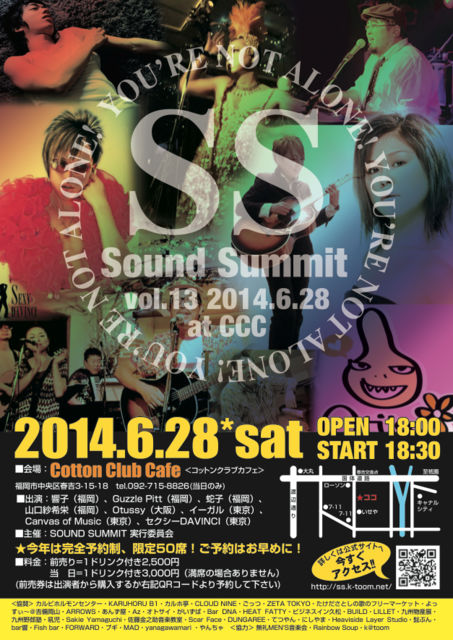 ǯ¤Ë°ìÅ٤ΥΥ󥸥ã¥ó¥ë¡¦¥Î¥ó¥»¥¯¥·¥ã¥ê¥Æ¥£¤Î²»³Úº× ¥²¥¤¤â¥Ó¥¢¥ó¤â¥Î¥ó¥±¤â¡¢¤Ò¤È¤ê¤Ò¤È¤ê¡¢¤ß¤ó¤Ê°ã¤¦¤«¤é¤³¤½ÂçÀڤʸºß¡ª ¡ØSOUND SUMMIT Vol.13¡Ù³«ºÅ·èÄꡪ ¢£Æü»þ¡§2014ǯ6·î28Æü¡ÊÅÚ¡Ë ¡¡¡¡¡¡¡¡18»þ³«¾ì¡¡18»þ30ʬ³«±é ¢£²ñ¾ì¡§Cotton Club Cafe¡ã¥³¥Ã¥È¥ó¥¯¥é¥Ö¥«¥Õ¥§¡ä Ê¡²¬»ÔÃæ±û¶è½ÕµÈ3-15-18¡¡tel.092-715-8826(ÅöÆü¤Î¤ß) ¢£½Ð±é¡§¶Á»Ò¡ÊÊ¡²¬¡Ë¡¢Guzzle Pitt¡ÊÊ¡²¬¡Ë¡¢¼Ø»Ò¡ÊÊ¡²¬¡Ë¡¢»³¸ý¼Ó´õ±É¡ÊÊ¡²¬¡Ë¡¢Otussy¡ÊÂçºå¡Ë¡¢¥¤¡¼¥¬¥ë¡ÊÅìµþ¡Ë¡¢Canvas of Music¡ÊÅìµþ¡Ë¡¢¥»¥¯¥·¡¼DAVINCI¡ÊÅìµþ¡Ë ¢£¼çºÅ¡§SOUND SUMMI