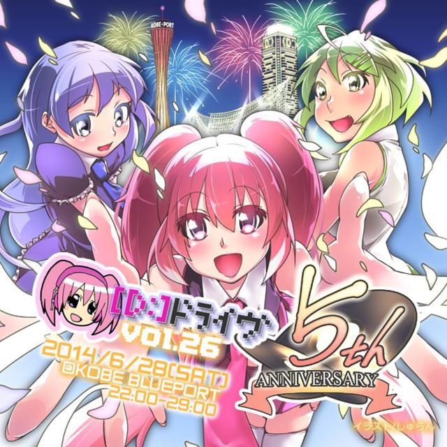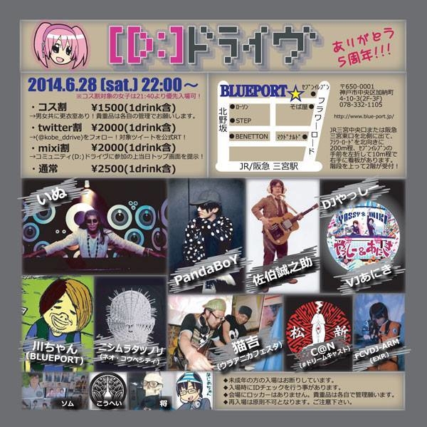 (D:)ドライヴ 5周年スペシャル 6/28(土)22時〜 at KOBE BLUEPORT いぬ/PandaBoY/佐伯誠之助/DJやっしー&VJあにき/猫吉/ニシムラタツノリ/川ちゃん/C@N/FCVDJ-ARM/VJあにき/ソム/こうへい/将/はじめちゃん 詳細は→http://tweetvite.com/event/dd26 Twitter→https://twitter.com/kobe_ddrive