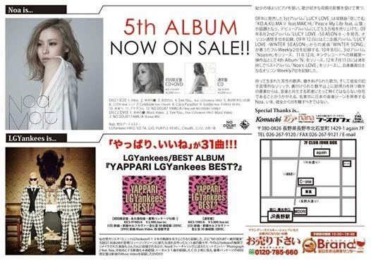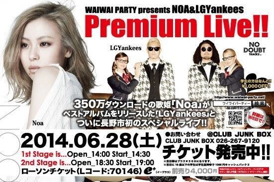 WAIWAIPARTY presents 『NOA&LGYankees premium live』 350万ダウンロードの歌姫「Noa」がベストアルバムをリリースした「LGYankees」とついに長野市内初のスペシャルライブを開催!! 場所→長野 CLUB JUNK BOX 日時→6月28日(土) <2部制> 1部 14:30スタート (14:00オープン) 2部 19:00スタート (18:30オープン) 料金→前売り4000円 当日4500円 (当日に18歳以下の学生は学生証持参で1000円キャッシュバック) 入場時別途1ドリンク代(500円) 取扱店はJUNK BOX ローソンチケ