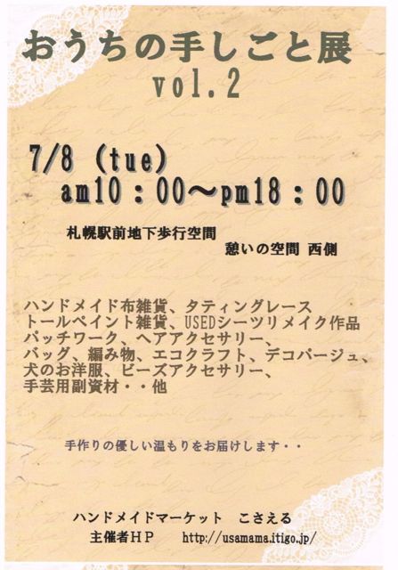 ¥Ï¥ó¥É¥á¥¤¥É¥Þ¡¼¥±¥Ã¥È¡¡¤³¤µ¤¨¤ë¥Õ¥¡¥ß¥ê¡¼¤Ë¤è¤ë ¥Ï¥ó¥É¥á¥¤¥É¥¤¥Ù¥ó¥È¡ª¡ª ¡ü¤ª¤¦¤Á¤Î¤Æ¤·¤´¤ÈŸvol2 ¡ü ¡ú£··î£¸Æü(²ÐÍËÆü¡Ë 10¡§00¡Á18¡§00³«ºÅ ¡ú»¥ËÚ±ØÁ°Ãϲ¼Êâ¹Ô¶õ´Ö¡¡·Æ¤¤¤Î¶õ´Ö¤Ë¤Æ