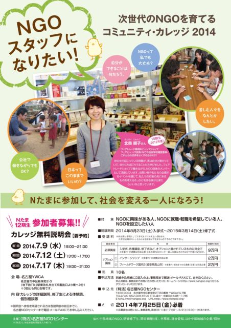 ●◎━━━━━━━━━━━━━━━━━━━━━━━━━━◎● 7/9(水)、7/12(土)、7/17(木) 無料説明会! 「NGOスタッフになりたい人のための研修2014」 ●◎━━━━━━━━━━━━━━━━━━━━━━━━━━◎● NGOスタッフになりたい人、 NGOや国際協力分野に就職・転職を希望される方、 NGOを設立したい方、 NGOでボランティアしたい方、必見の情報です! 無料説明会【要予約】 [第1回]2014.7.9(水) 19: