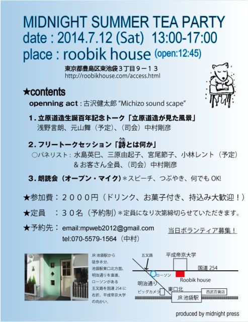 この度、詩の出版社ミッドナイト・プレス主催の定期イベント「ミッドナイト夏のお茶会」を開催します。 お茶やお酒を飲みながら、ざっくばらんに詩をはじめ、文学、哲学、芸術などなどについて、語り合う会です。 第一部:「立原道造生誕百年記念トーク」 浅野言朗(詩人)&元山舞(詩人、予定)、中村剛彦(司会) 第二部:フリートーク「詩(うた)とは何から」*さまざまな「場所」から発信される「ことば」について語り合いたいと思います。 水島英巳(詩人、奄美徳之島出身)、三原由起子(歌人、福島県浪江町出身)、宮尾節子(詩人、