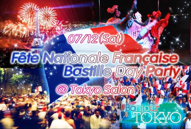 Bonjour Tokyo は、今年のパリ祭、革命記念日(7月14日)のお祝いを、7月12日(土)にTokyo Salonで開催します!! トリコロールカラーに彩られたクレージーなパーティで東京のフレンチコミュニティの雰囲気を楽しんでください!! 青、白、赤のトリコロールカラーの物を見に着けて来てください^ ^ 持っていれば、フランスの旗も持って来てくださいね! フロアでは、DJが楽しい雰囲気を作り出します。 そして、今回はフランスの記念日らしく、フレンチカンカンのショーがありますよ♪ 記憶に残るパーティになること間違いなしです!!