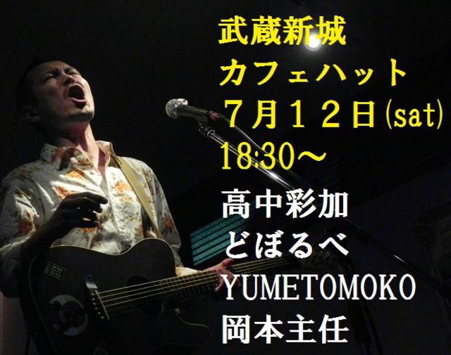 nakasan主催 7月12日(土) 武蔵新城:カフェハット チャージ無料・投げ銭制(+オーダー) 18:15/18:30 とにかく、ここの生パスタを食べに来て!うまいYO! 高中彩加 どぼるべ YUMETOMOKO 岡本主任 どうやら、私がトリの様です。 盛り上げに来てください! 〜アクセス〜 南武線「武蔵新城」下車 。 南口に出て、すぐ左。ガード沿いに歩く。 マルエツで右折。 あとずーとまっすぐ。 スーパー「クリシマ」過ぎたら、左側に注目! 美容室の2階がカフェハット。