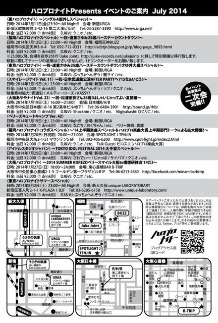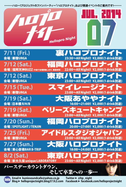 お世話になっております。 今回は、 Hello!Project 2014 SUMMER 〜KOREZO! 初日終了後、福岡ハロプロナイト、第一回目を飾った場所、 『天神BUZZ』に会場を戻し、 モーニング娘。'14のリーダー、 道重さゆみさんのお誕生日を祝う総力特集後にいつもの会場、 『juke joint』に移動するスペシャルプログラムです! 趣向の違う2会場を同一料金にて体感できる一晩を、 是非ともご一緒頂ければ嬉しく思います! “福岡ハロプロナイトスペシャル” 〜祝・道重さゆみ25歳バースデーカウントダウン!〜 日時:2014年7月12日(土