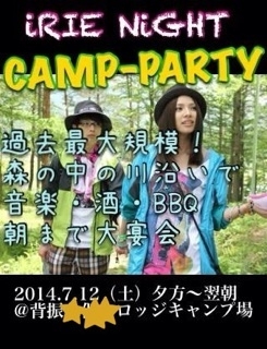 iRIE NiGHT…★ 〜Summer Camp Party〜 『山の中の川沿いで、音楽・酒・BBQ・花火!』 真夏の始まりに過去最大級のキャンプパーティーを開催します。 トトロが出そうな山の中のロッジを三棟貸し切ります! ロッジの目の前には綺麗な川が流れており、渓流釣りや水遊びもできます。 最高のロケーションで、自然を感じながら遊びましょう! 川のせせらぎを聴きながら、ゆったり過ごしたり、DJフロアでダンスミュージックを楽しんだり、楽しみ方は各々自由です! 宿泊・休憩用に各々30人収容可能なロッジが3棟(MAX90名)あります