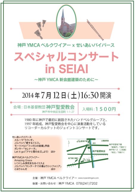 2007年より神戸聖愛教会にて活動しているリコーダーカルテット"せいあいパイパーズ"と 1980年に神戸で最初に創設されたハンドベルグループである"YMCA神戸ベルクワイアー"さんとでジョイントコンサートを開きます。 YMCA神戸ベルクワイアーさんの主催で、神戸YMCA新会館建築の助成を目的に開きます。 日時:2014年7月12日(土) 16:30開演 入場料:1500円(チケットをお求め下さる方はcherry宛てにメール・メッセージをいただけると嬉しいです。 若しくは、神戸YMCAさん、神戸聖愛教会さんにお問い合わせ下さい。) 会場