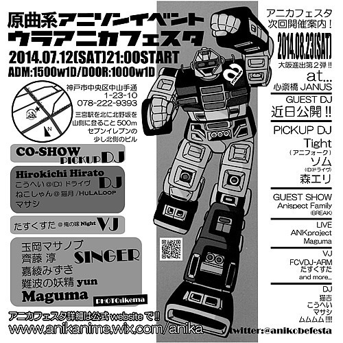 管理人様、貴重なスペースでの告知を失礼いたします。 ウラアニカフェスタ vol.12 【Event Information】 ●日時 2014/07/12(土) START:21時〜 ●会場 神