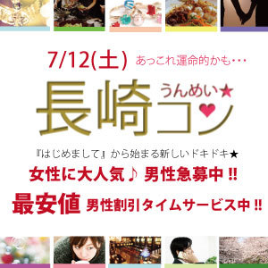 7月12日(土)【長崎の街コンなら...長崎うんめいコン♡】 うんめいコンが長崎で開催決定! 【※女性キャンセル待ちと大人気の為男性急募中!】 【※なんと男性最安値⇒4,900円】 男女比率100%・2:2の対面式・席替えあり! 安心のシステムで、多くの方と話せます♪ 是非ご参加下さい! 詳細はこちら http://www.nagasaki-unmei.com/