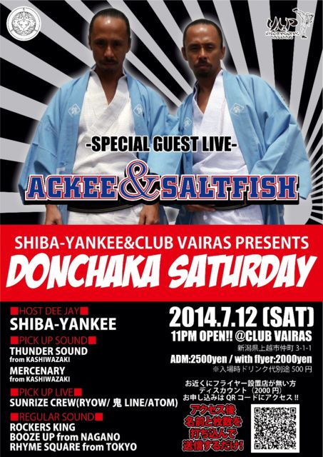 管理人様、告知失礼致します。 2014.7.12 (SAT) 【DONCHAKA SATURDAY】 23:00 OPEN!! @CLUB VAIRAS 新潟県上越市仲町3-1-1 Admission 2500円 with flyer 2000円 ※入場時ドリンク代別途500円 ※お近くにフライヤー設置店が無くディスカウント御希望の方は clubvairas@gmail.comまたは、各出演者にお名前と人数を連絡下さい。 2000円で御入場頂けます。 SHIBA-YANKEE -SPECIAL GUEST LIVE- ACKEE & SALTFISH -PICK UP SOUND- THUNDER SOUND from KASHIWAZAKI MERCENARY from KASHIWAZAKI -PICK