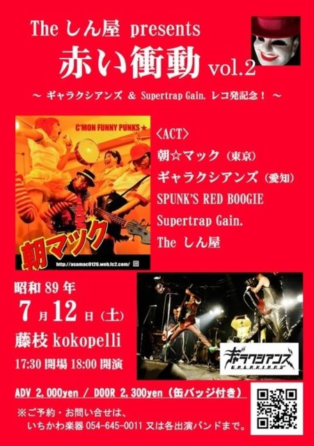 目と耳に優しい(笑)爆音ロックンロールイベントのお知らせです! ☆★☆★☆★☆★☆★☆★☆★☆★ The しん屋 presents "赤い衝動 vol.2" 昭和89年7月12日(土) @藤枝kokopelli open 17:30 / start 18:00 adv 2,000yen / door 2,300yen+drink (もれなく"赤い衝動"缶バッジが付いてくる!) <act> 朝☆マック(東京) ギャラクシアンズ(名古屋) SPUNK'S RED BOOGIE Supertrap Gain. The しん屋 ☆★☆★☆★☆★☆★☆★☆★☆★ ★しん屋企画の第二弾は、東京から直球どパンクガールズバンド"朝☆マック"が出演!