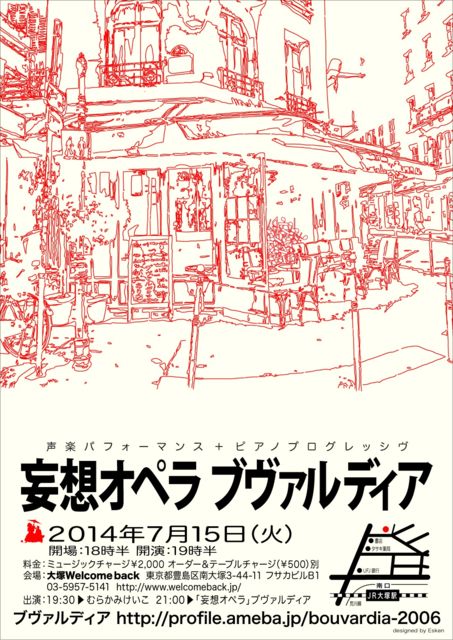 ウェルカムバックライブ 2014年7月15日(火)開場:18時半 開演:19時半 【 大塚Welcome back】http://www.welcomeback.jp/ 住所 東京都豊島区南大塚3-44-11 フサカビルB1 電話&Fax 03-5957-5141 出演 19時半〜 むらかみけいこ http://mfkeiko.jimdo.com/?logout=1 21時〜 「妄想オペラ」ブヴァルディアhttp://profile.ameba.jp/bouvardia-2006 料金 ¥2000+テーブルチャージ¥500+オーダー