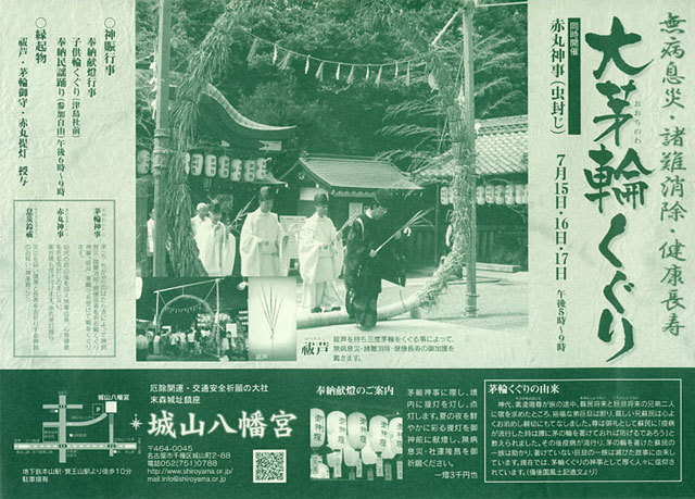 無病息災。諸難消除・健康長寿 〜大茅輪くぐり〜 <同時開催>赤丸神事(虫封じ) ●平成26年7月15日(火〜7月17日(木) ●午後5時〜午後9時に開催。 ○神賑行事  奉納献燈行事  子ども輪くぐり(津島神社前)  奉納民謡踊り(参加自由・午後6時〜9時) ○縁起物  祓芦・茅輪御守・赤丸ちょうちん 授与 詳細については、社務所(751-0788)にお問合せ下さい。 ※公式HP:http://www.shiroyama.or.jp/