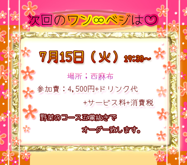 またまた久しぶりにワン∞ベジを開催いたします!! 西麻布のお洒落なレストラン!今回はちょっとお高めですが、素晴らしいレストランです♪ ぜひ、皆さんとこの美味しさと感動を共有したいと思います! 皆さまのご参加をお待ちしています\(^o^)/ 場所は 参加表明頂いてからメッセージよりお知らせします☆彡 【参加費】4,500円+ドリンク代+サービス料+消費税     野菜のコース五葷抜きでオーダー致します。 【申込締切】2014年7月10日(木) 【備考】前日・当日のキャンセルはキャンセル料が発生致します。ご了承ください。 ベジ