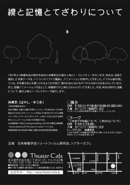 1997年より映像作品の制作を始めた林勇気氏の展示上映とトークレクチャーを行います。林氏は、自身で撮影した写真データを、パソコンのソフトで編集し、アニメーションを制作してきました。デジタル感を残しつつも、手作業のあとを感じられるような作風で、現代社会におけるデジタルのあり方をあらわしています。また、短編アニメーション作品として、映画祭での上映もさかんに行ってきました。今回、林氏の制作と活動について、展示上映とトークレクチャーで紹介します。 シアターカフェ全体(上映+展示スペース)を使用しての映像作品の展覧会となりま