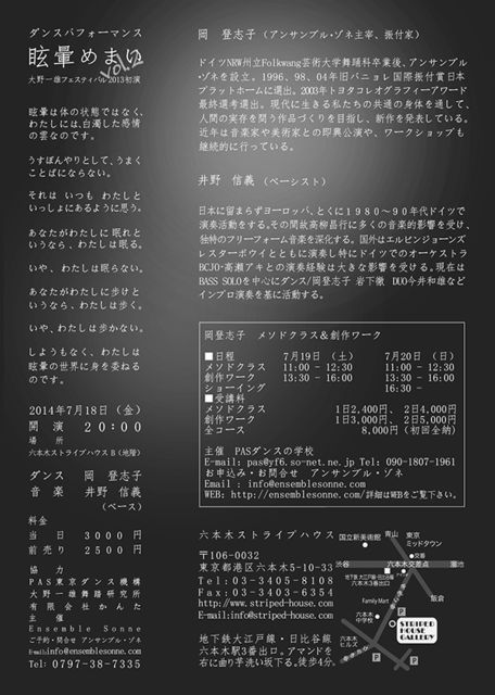 管理人様貴重なスペースをお借り致します アンサンブル・ゾネ主宰の岡登志子とベーシスト井野信義による ダンスと音楽の即興公演のお知らせです。 予約受付を開始しました! お席が少なくなっておりますのでお早目のご予約をお勧めいたします! 【公演情報】 眩暈 めまい vol.2 〈大野一雄フェスティバル2013初演〉 微妙なバランスが崩れてしまうこと、そこからダンスが始まる。 わたしは、三半規管を凍らせる眩暈(めまい)を愛している。 ポーの小説「メエルシュトレエムに呑まれて」の漁師のように、 眩暈の