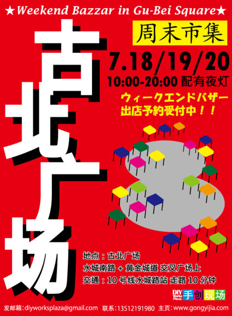 7月18、19、20日の三日間、古北広場にて大型バーザーを開催します。 手作り、アクセサリー、子供用品、生活雑貨などなどたくさんの店が出店します。 このバザーは個人でも企業でも誰でも参加できるイベントです。 皆様のご来場やご出店等をお待ちしております。 ★日付:7月18、19、20日 10〜20時 ★会場:古北広場(フクゼンの前・万科広場エリア) ★住所:水城南路+黄金城道の交差点 ★交通:10号線水城路駅から10分ごろ歩く ★出店:3日間/950元/2.4*0.6mテーブル/テントあり 出店予約:diyworksplaza@gmail.com お名前/